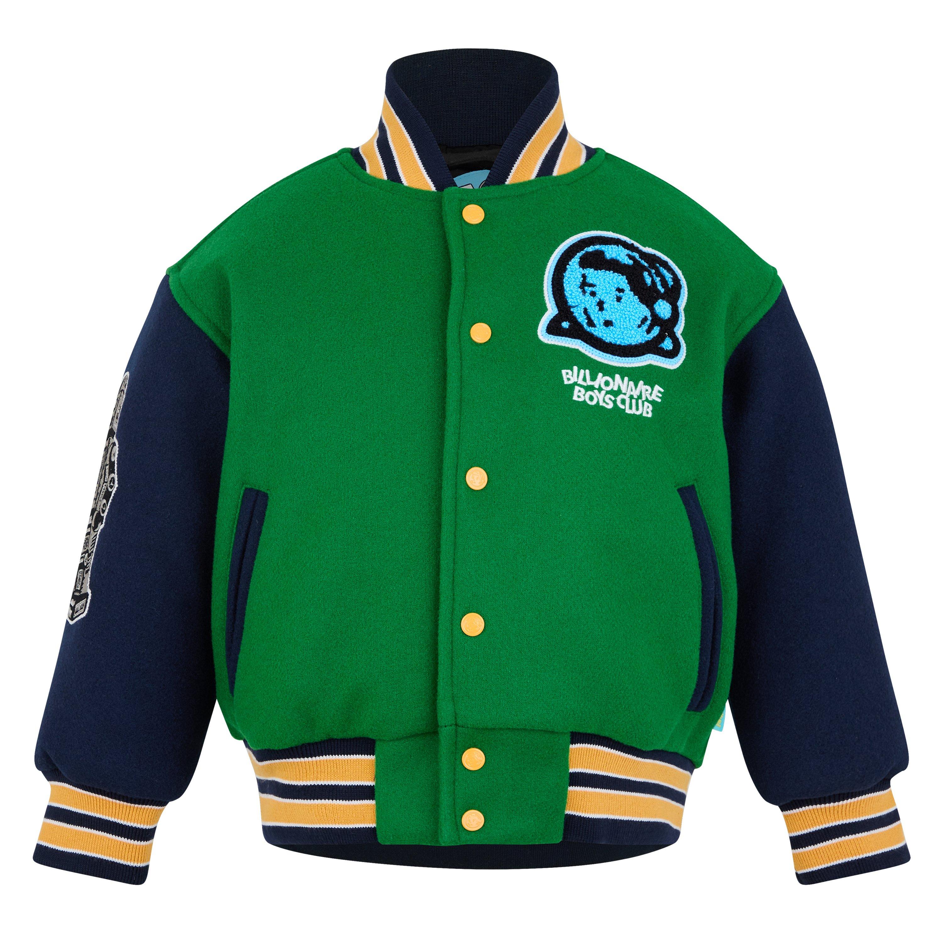 Designed in a combination of colours with yellow striped trims, this jacket is a true fashion masterpiece. The embroidered Billionaire Boys Club logo at the front, the chenille appliqué logo patch at the chest and back, and the embroidered robot at the right sleeve add unique touches of sophistication, reflecting the brand's iconic design aesthetic. Elevate your young one's wardrobe and let them embrace the extraordinary with the Billionaire Boys Club Astro Varsity Jacket.