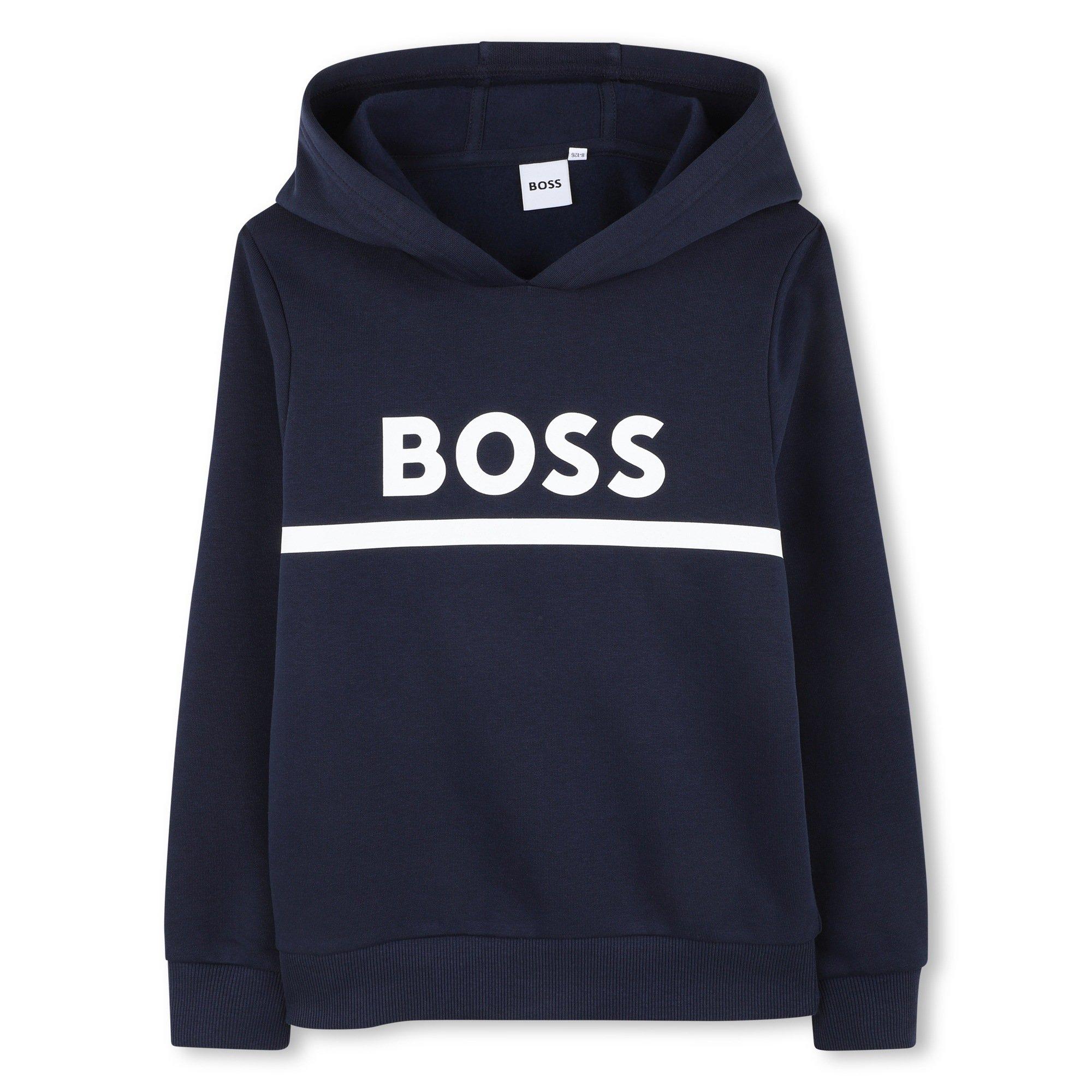BOSS Kids' Pull Over Hoodie delivers casual comfort and style. The overhead design features a spacious kangaroo pocket and adjustable drawstring hood for customisable warmth, while ribbed cuffs and trims ensure a secure fit that moves with active young wearers.