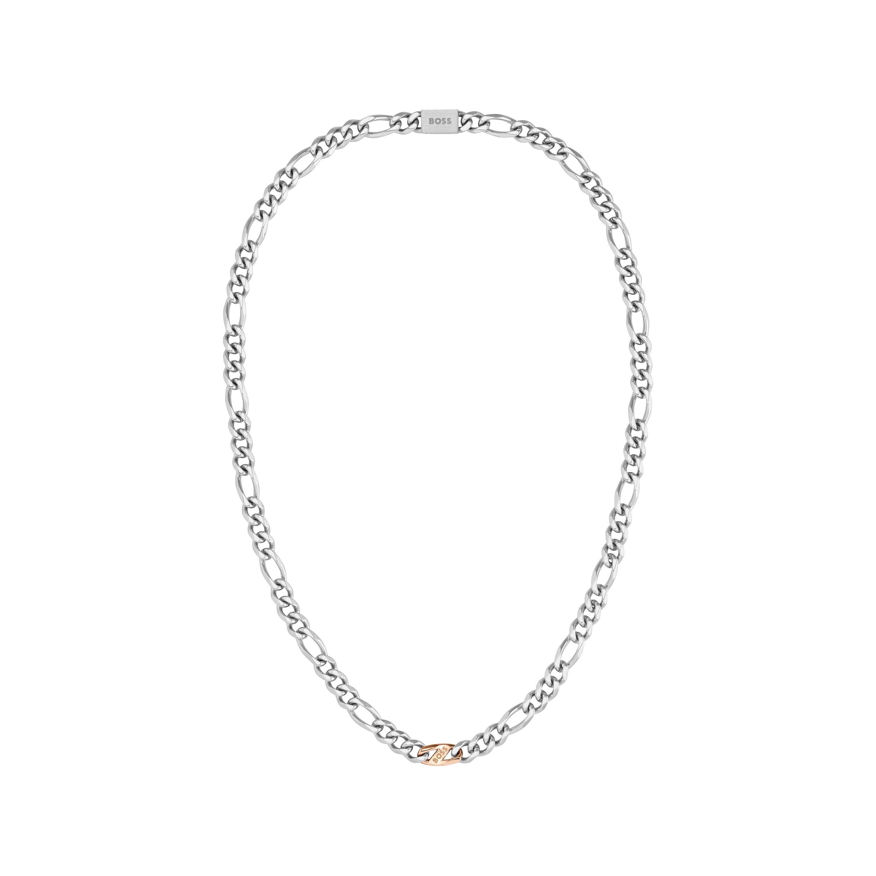 The BOSS Rian Chain is built from stainless steel with a Figaro link structure. A magnetic clasp allows quick fastening without fiddly closures.