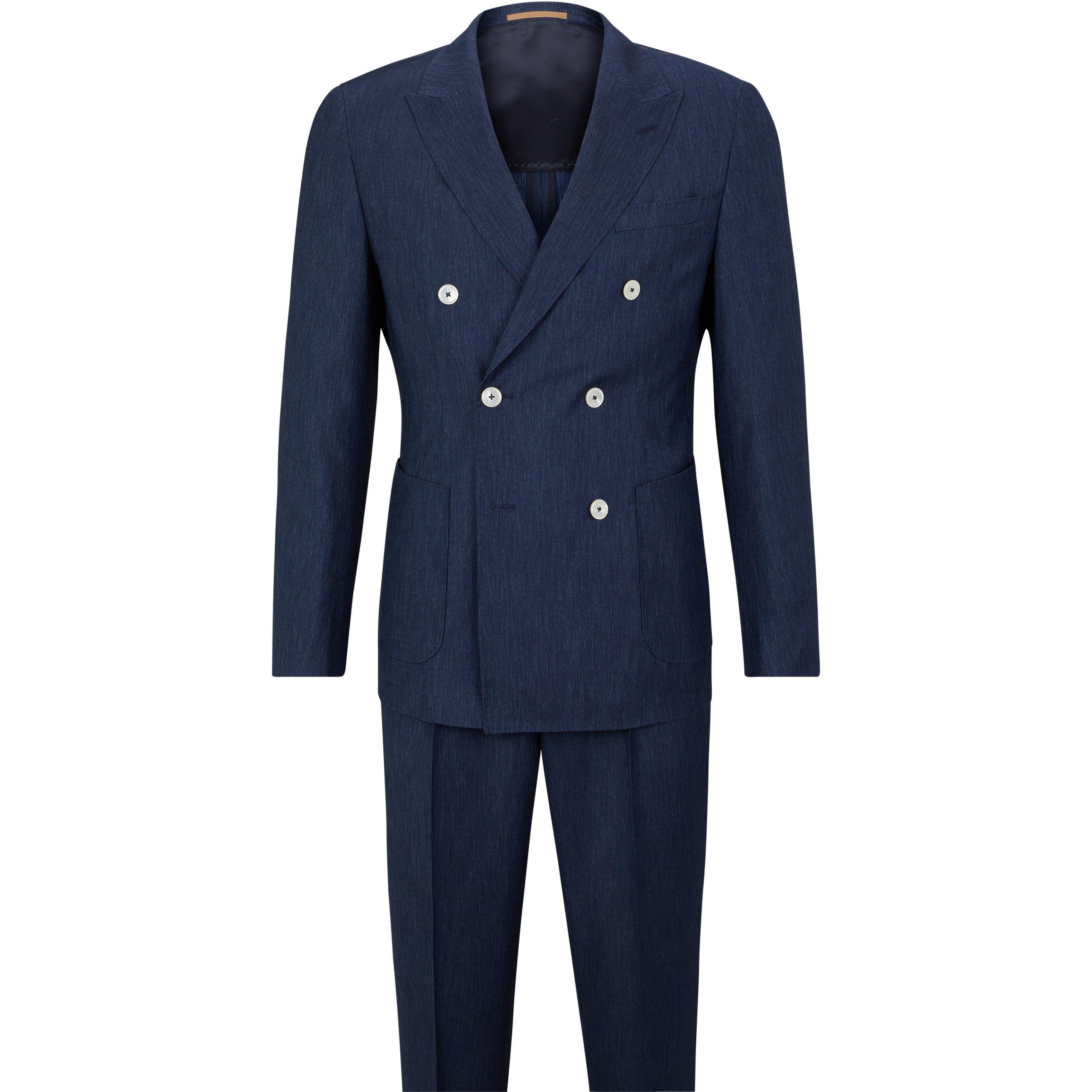 The BOSS Men's T Heston Double Breasted Suit delivers formalwear with modern precision. This two-piece features a distinguished double-breasted cut with structured shoulders and a tailored form that creates a smart profile for professional settings.