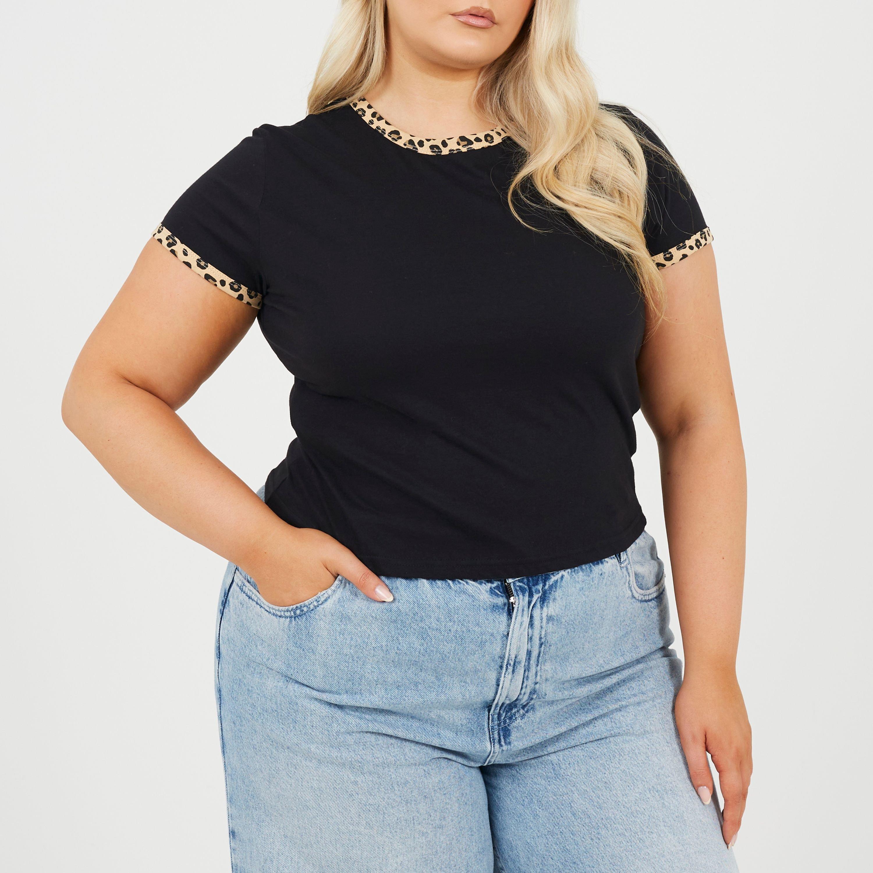 Brave Soul Plus Size Short Sleeve T-shit with Leopard Print Neck and Sleeve Rib