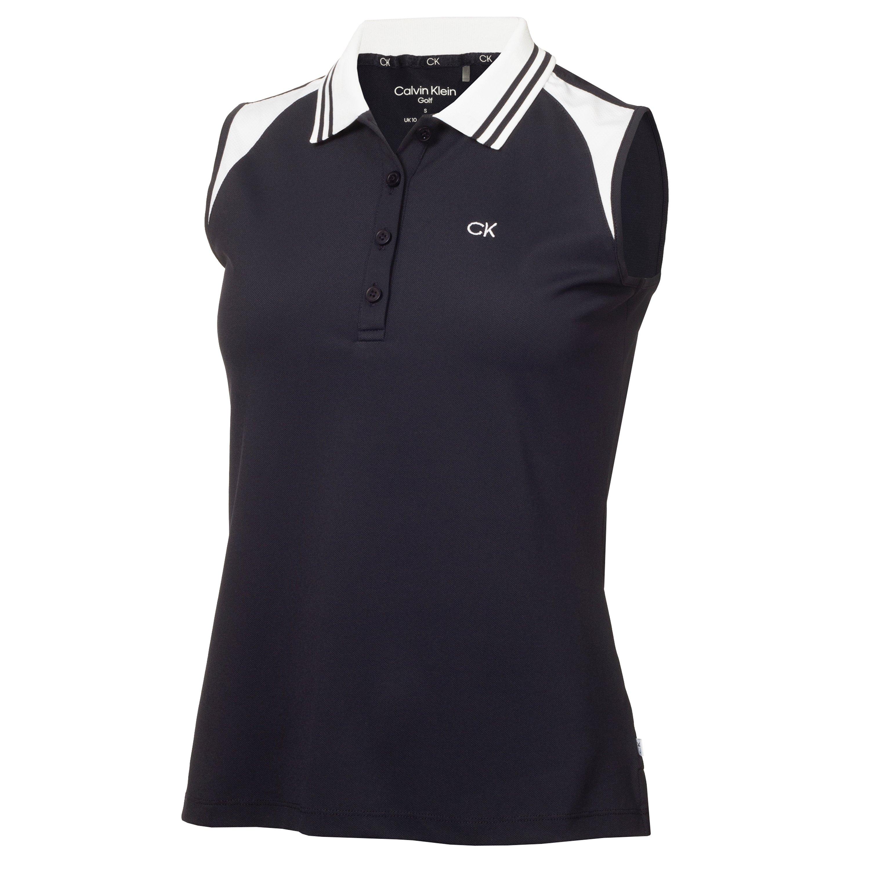 Calvin Klein Golf's Women's Sleeveless Performance Polo Shirt delivers athletic style with technical function. Made with moisture-wicking fabric and a sleek collarless design, it offers unrestricted movement for optimal performance on the course.