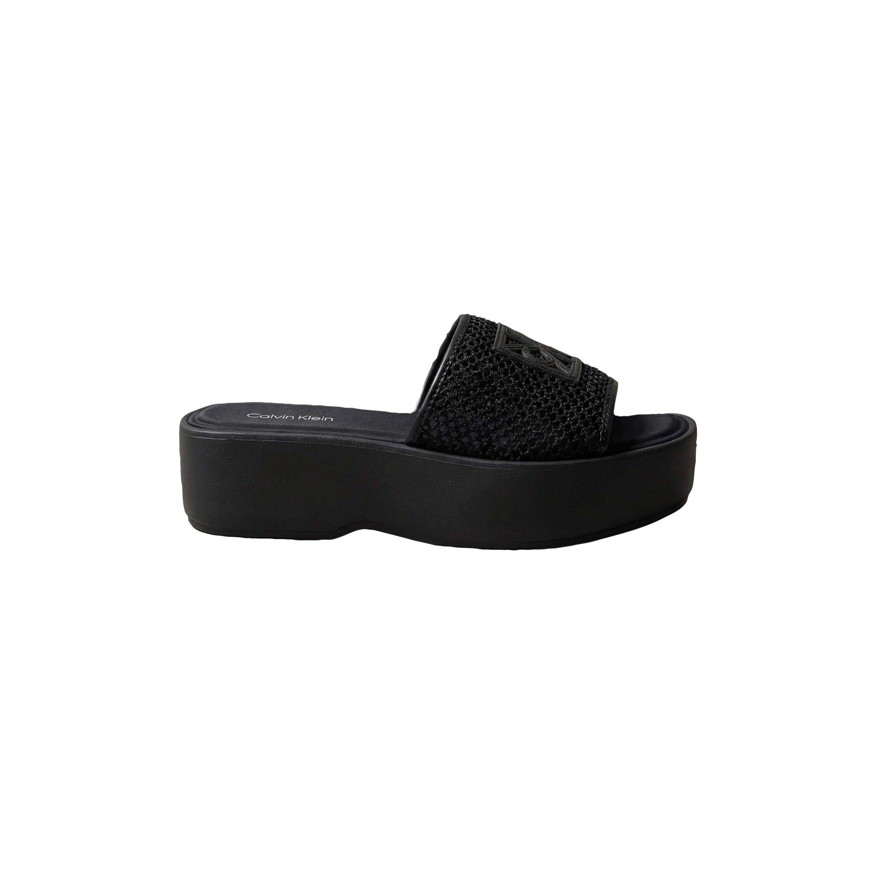 The Calvin Klein Women's Flatform Sandals maintain a streamlined profile with a structured sole. The height sits evenly underfoot for balanced support.