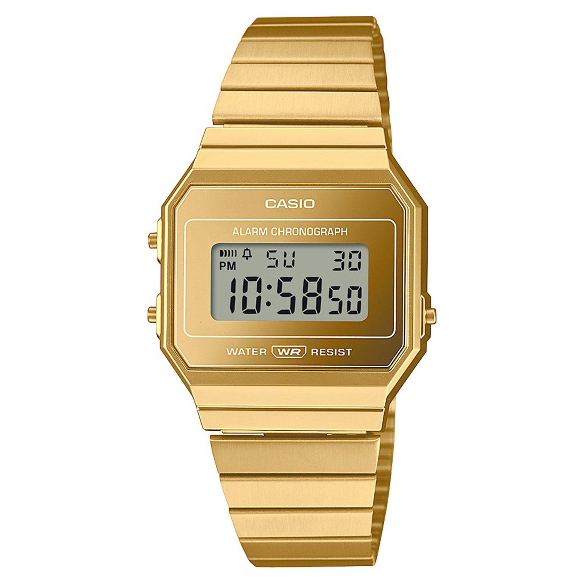 Casio's Adults Digital Wristwatch from the A700 series delivers fashion with a monochromatic design. This casual timepiece balances vintage appeal with practical features for everyday wear.