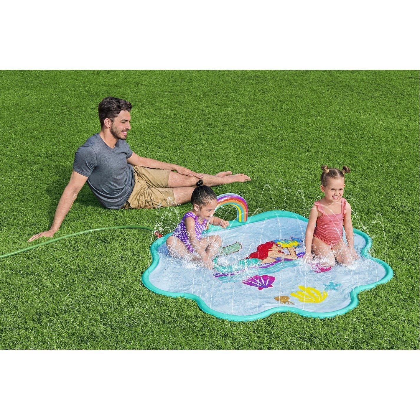 FOR AGES 2+: Splash pad is 64 x 57/1.63m x 1.45m LITTLE MERMAID THEME: Disney Little Mermaid graphics inspire your child to be adventurous and courageous BUILT-IN FEATURES: Sprinklers surround the splash pad and spray in a gentle fountain effect toward the center EASY ASSEMBLY & TAKE DOWN: Conveniently and easily attaches to a garden hose (garden hose not included); Simply remove the hose and allow the splash pad to dry before folding it up and storing it for the next use Contents: 1 splash pad, repair patch