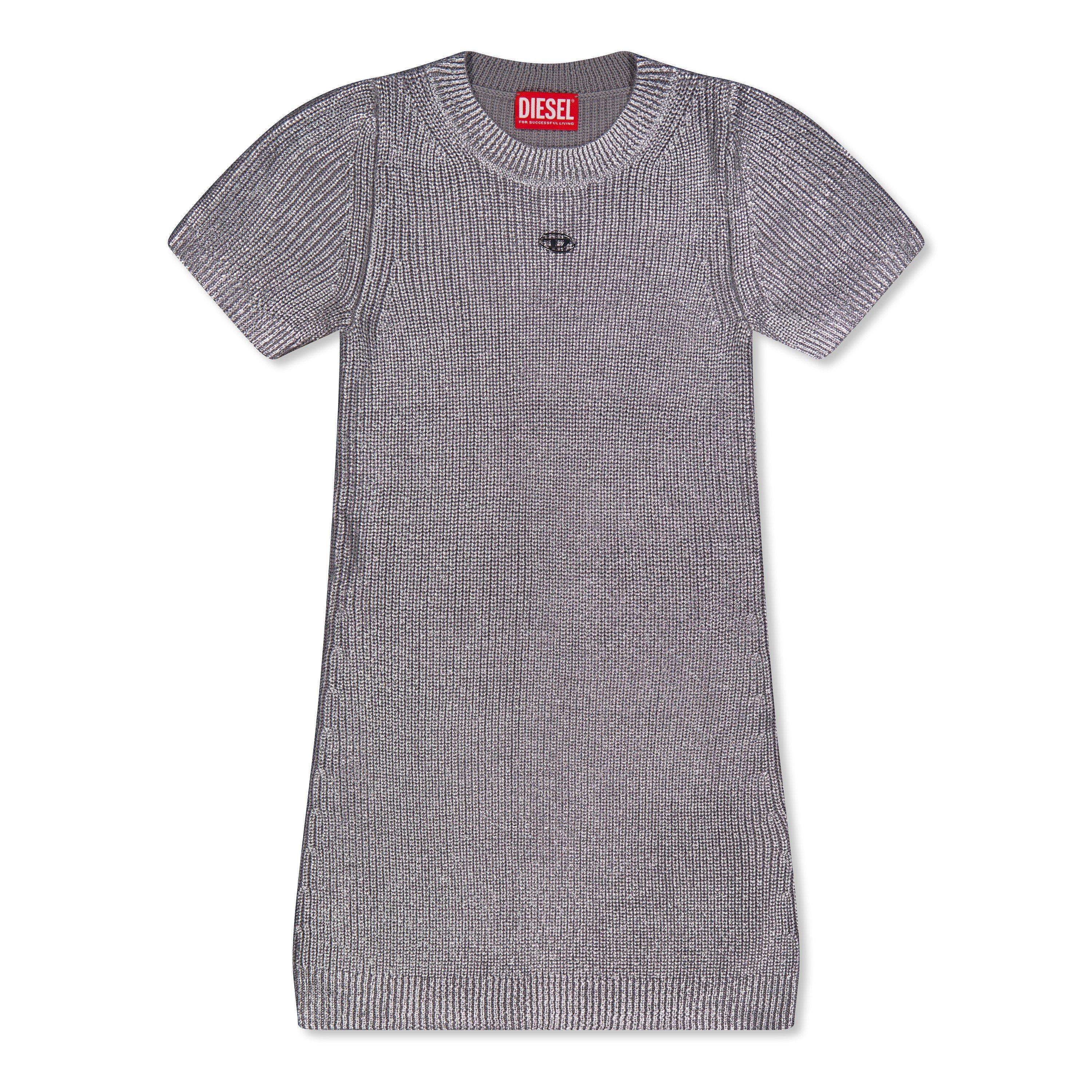 The Diesel Kids' Metallic Knitted Jumper Dress features a soft knit with subtle metallic detailing. This practical dress shape allows for easy movement throughout the day.