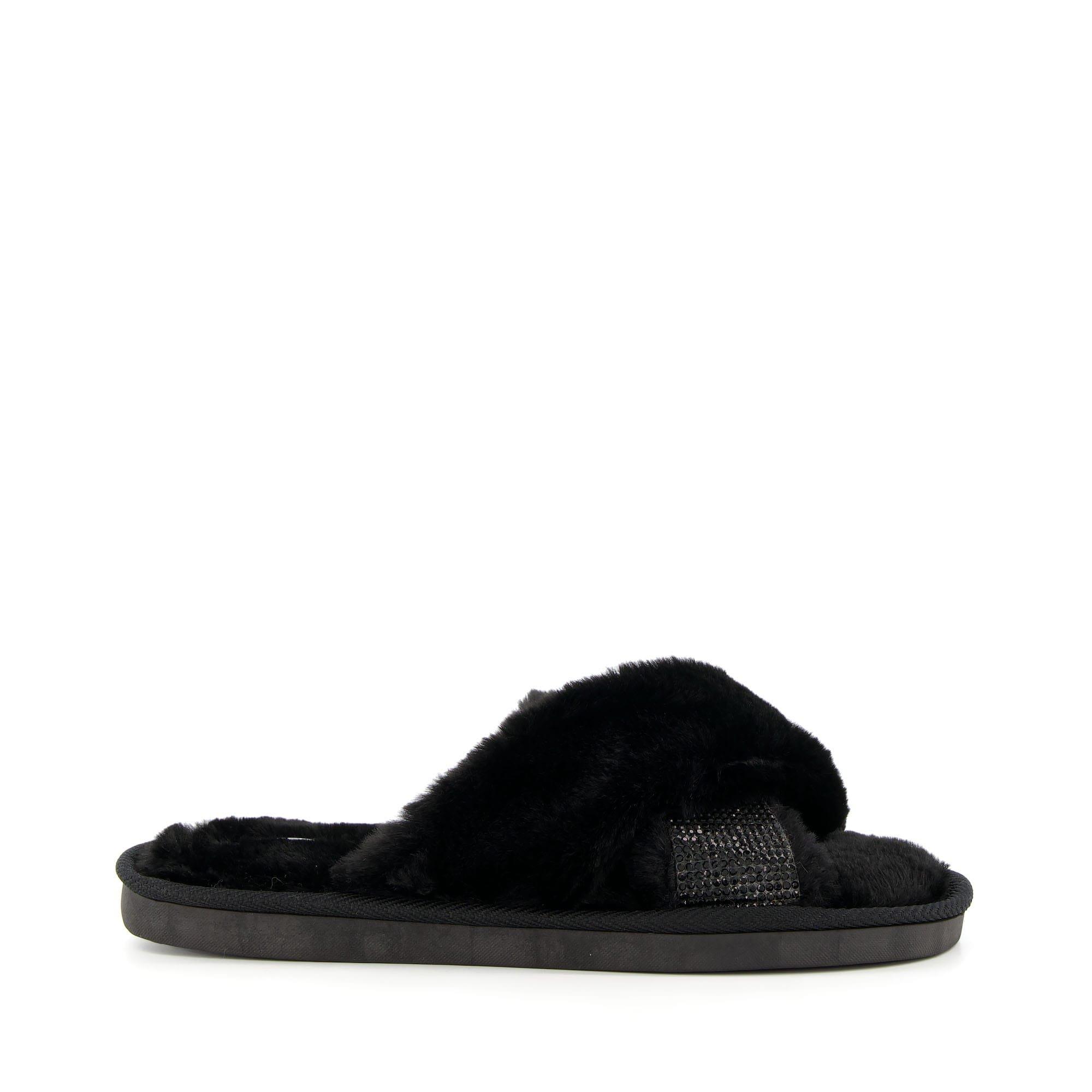 Synthetic textile upper with a faux fur lining. Winta slip-on slider style with an open toe. Diamante rhinestones on one cross-over strap.