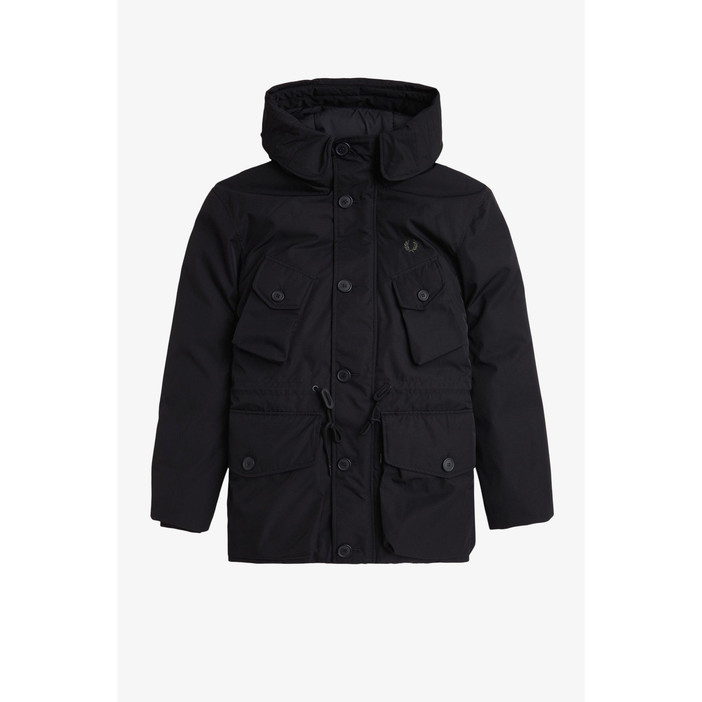The Fred Perry Patch Puffer Hooded Thigh Length Parka delivers insulation with urban fashion style. Featuring a straight cut for unrestricted movement, this thigh-length design has a secure zip and button closure with a protective drawstring hood for reliable winter weather performance.
