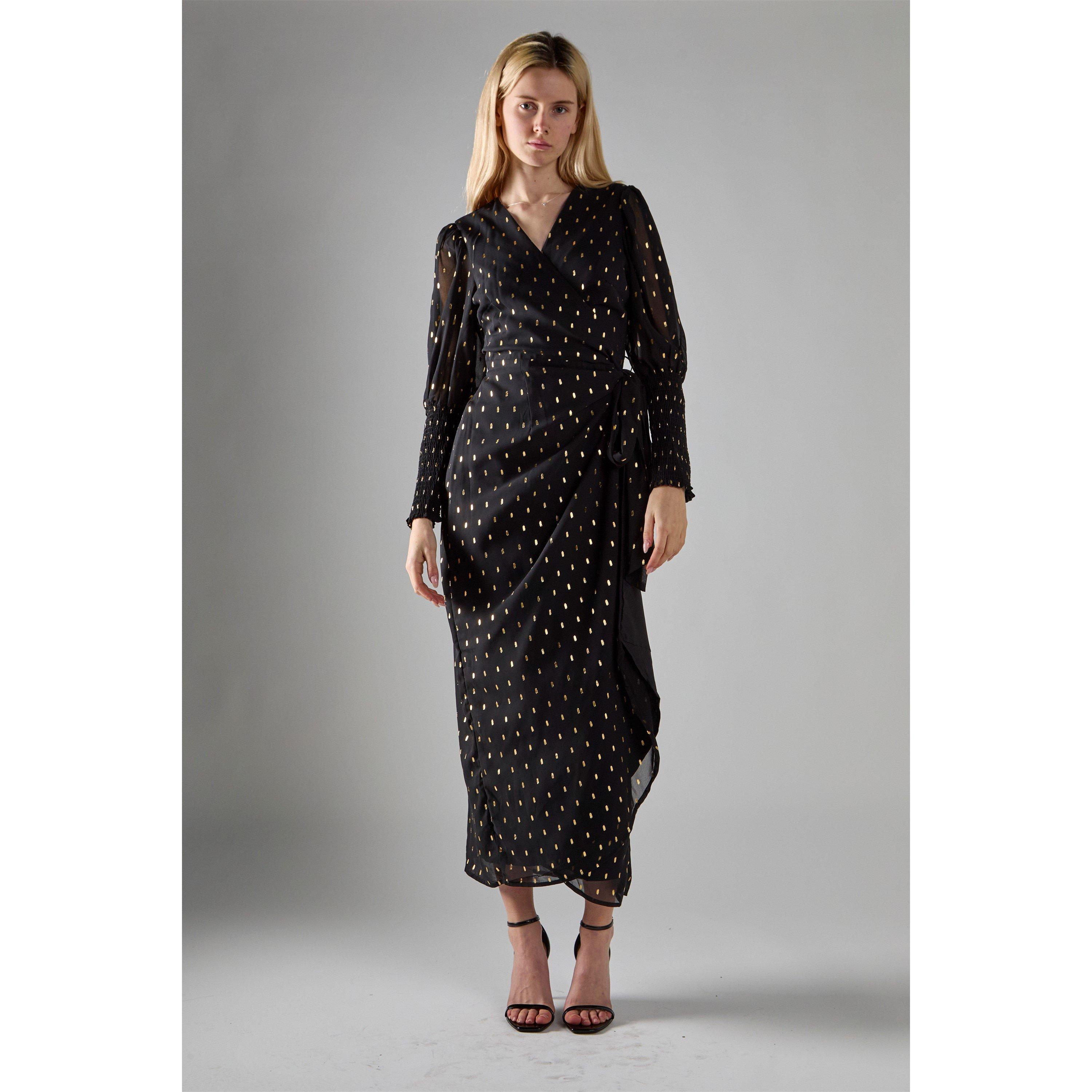 Glamorous Women's Black with Gold Spot Long-Dress. This Black Gold Spot Long Dress brings effortless charm to your wardrobe. The Black colour creates a lush backdrop for delicate gold spots that add a touch of shimmer and warmth to the fabric. With its flattering V-neckline and adjustable tie waist, this dress offers a custom fit that highlights your shape with comfort. The long, flowing silhouette drapes beautifully, offering a soft, relaxed look that still feels put-together. Style it with a cozy cardigan for chillier days, or pair with simple accessories to let the elegant pattern take centre stage. Perfect for dinners, gatherings, or just an elevated everyday look, this dress keeps things both relaxed and refined.