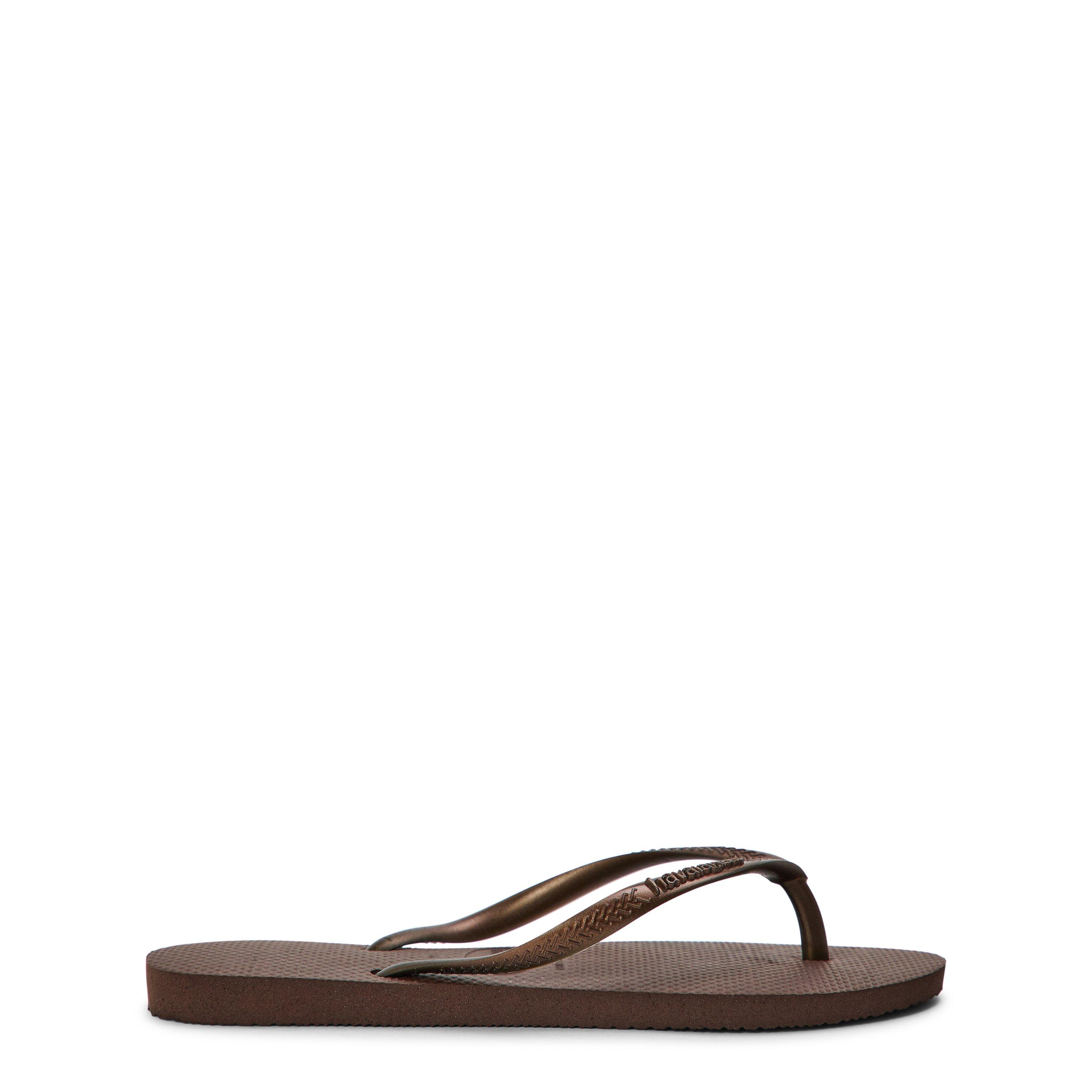 The Havaianas Slim Dark Brown Metal Flip Flops are built on a clean, minimal design with a striking profile. Metal detailing adds an upscale accent to the classic style.