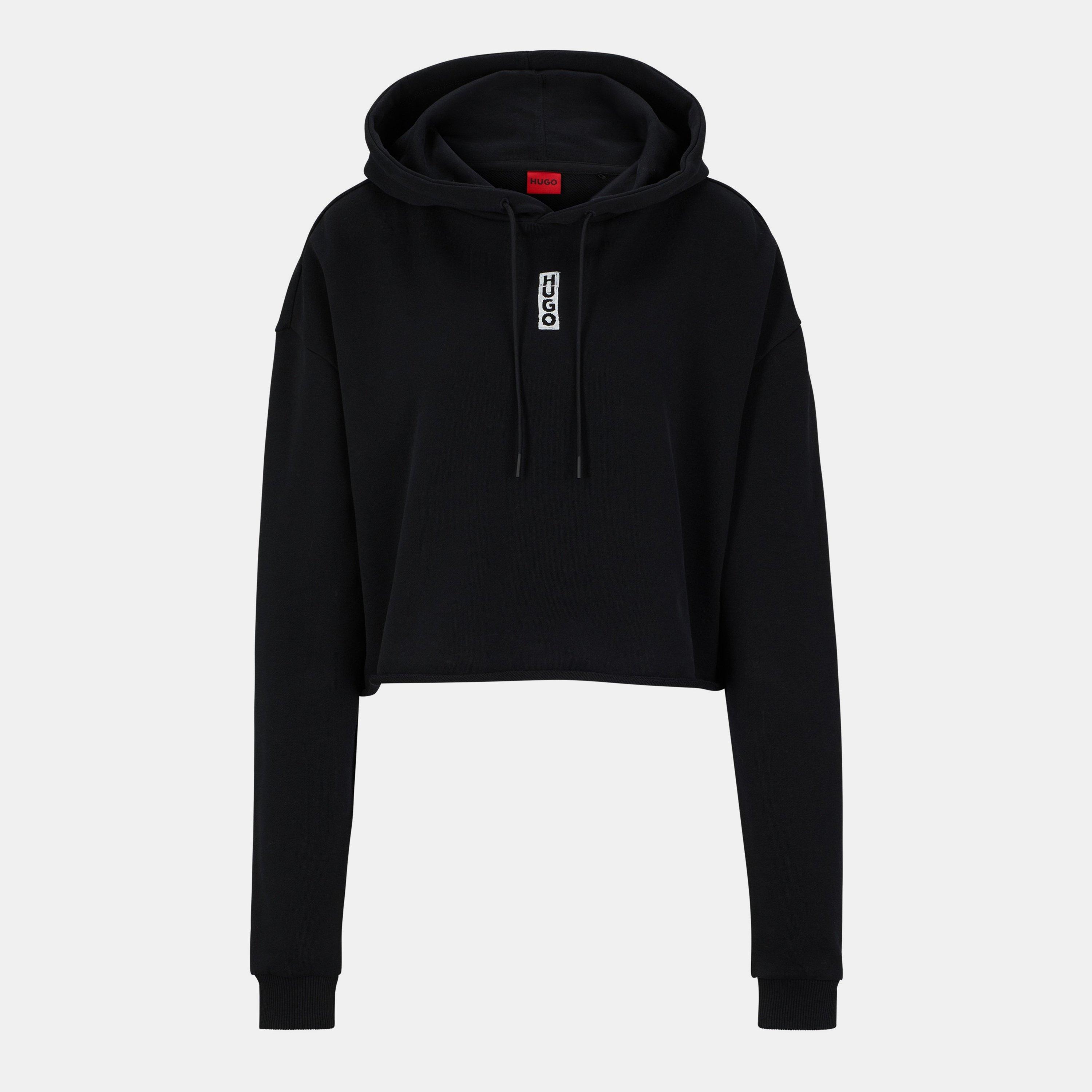 Introducing the Women's HUGO Dephana Black Hoodie - Embrace style and sustainability with this cropped hoodie from HUGO Womenswear. Crafted in peached terry fabric, it boasts vertical logos on the front and back. With your purchase, you're making a positive impact on the environment and supporting sustainable cotton farming in Africa. This CmiA labeled garment is dedicated to enhancing the lives and working conditions of African cotton farmers while preserving nature. 100% Cotton, Machine wash at 30°C on a gentle cycle.