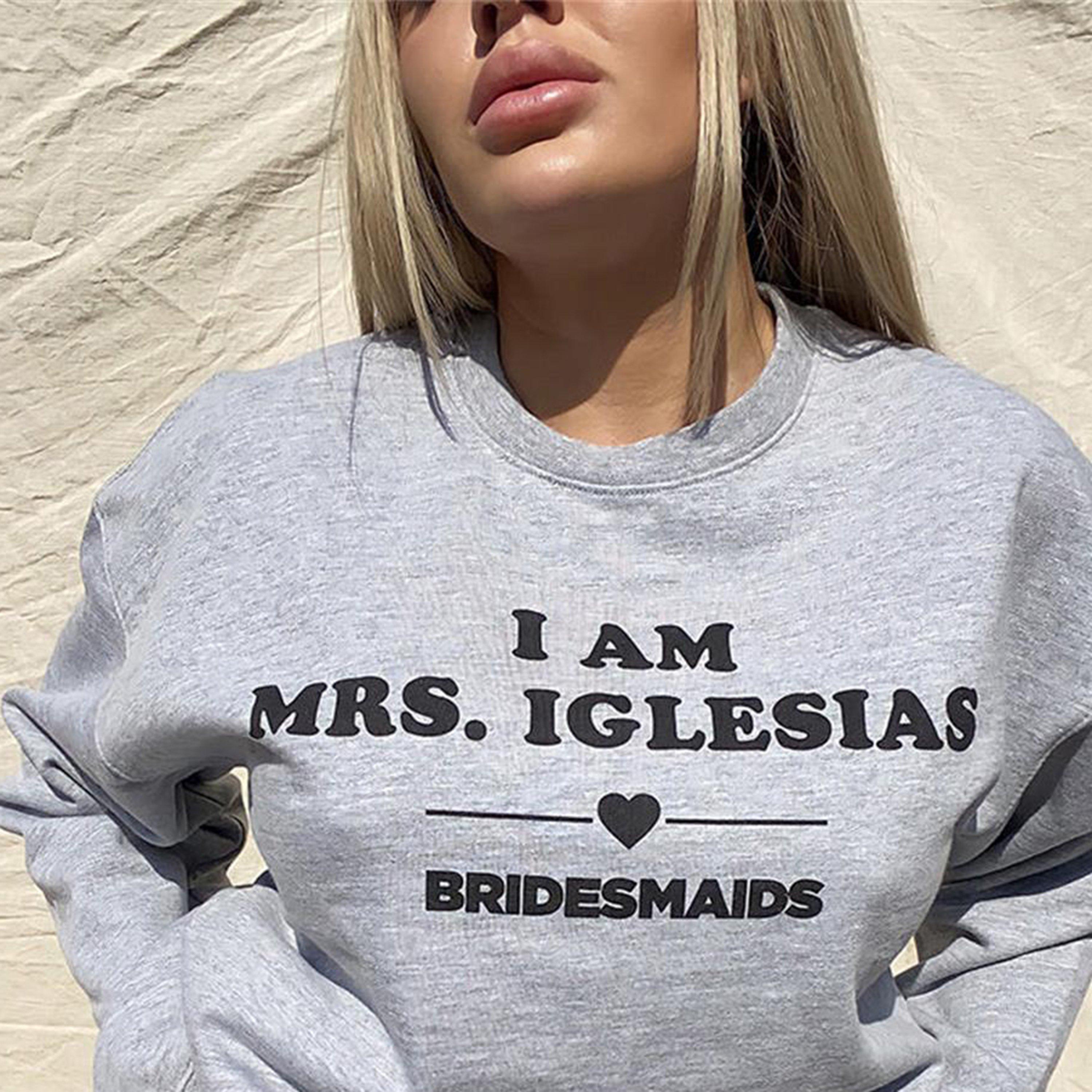 sweatshirt in an oversized fit featuring a crew neckline, with long sleeves and a large 'I Am Mrs. Iglesias' graphic on the front. **Influencer wears a S/UK 8 and her height is 5'3