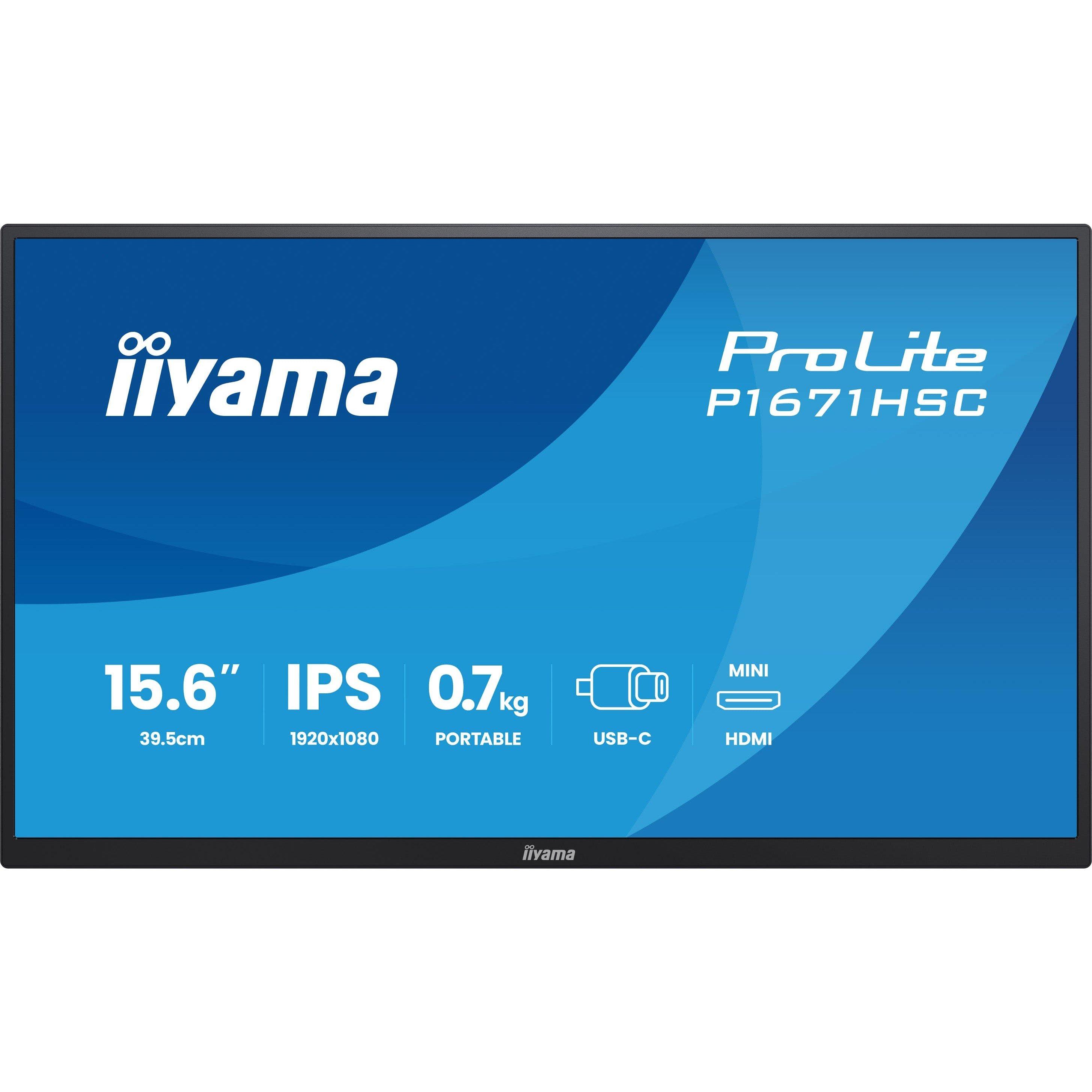 iiyama PROLITE P1671HSC-B1 15.6 Inch Portable Full HD IPS Monitor • Screen Size: 15.6 Inch • Panel Type: IPS • Response Time: 3ms • Refresh Rate: 60Hz 15.6 inch portable Full,HD IPS monitor with USB C, built in speakers & leather cover Work anywhere with the iiyama ProLite P1670HSC B1, a 15.6 inch portable Full,HD IPS monitor weighing just 0.7,kg. Slim and light, it’s ideal for travel, remote work, or hot desking. Quick to set up, it offers two viewing angles (45 degree or 60degree) and a leather cover that protects the screen and doubles as a stand. Built in speakers deliver clear audio for calls and media, removing the need for extra devices. A USB-C cable handles the display signal from your laptop to the monitor, while the crisp panel, flicker-free technology, and blue light reduction ensure comfort and productivity all day.Travel light and stay productive anywhere Take this 0.7,kg portable monitor with you and create a 15.6 inch Full HD dual-screen setup perfect for boosting productivity on the go.Adjust your view for better comfort Choose between 45 degree and 60degree viewing angles to reduce neck strain and find the most comfortable position for work or entertainment.Connect with ease, work in comfort With USB-C delivering up to 95W, your laptop stays charged while you work, using just a single, clutter-free connection. The reversible design means you never have to fumble or check which way to plug it in. It’s a simple, reliable solution that keeps your focus on what matters most. Features