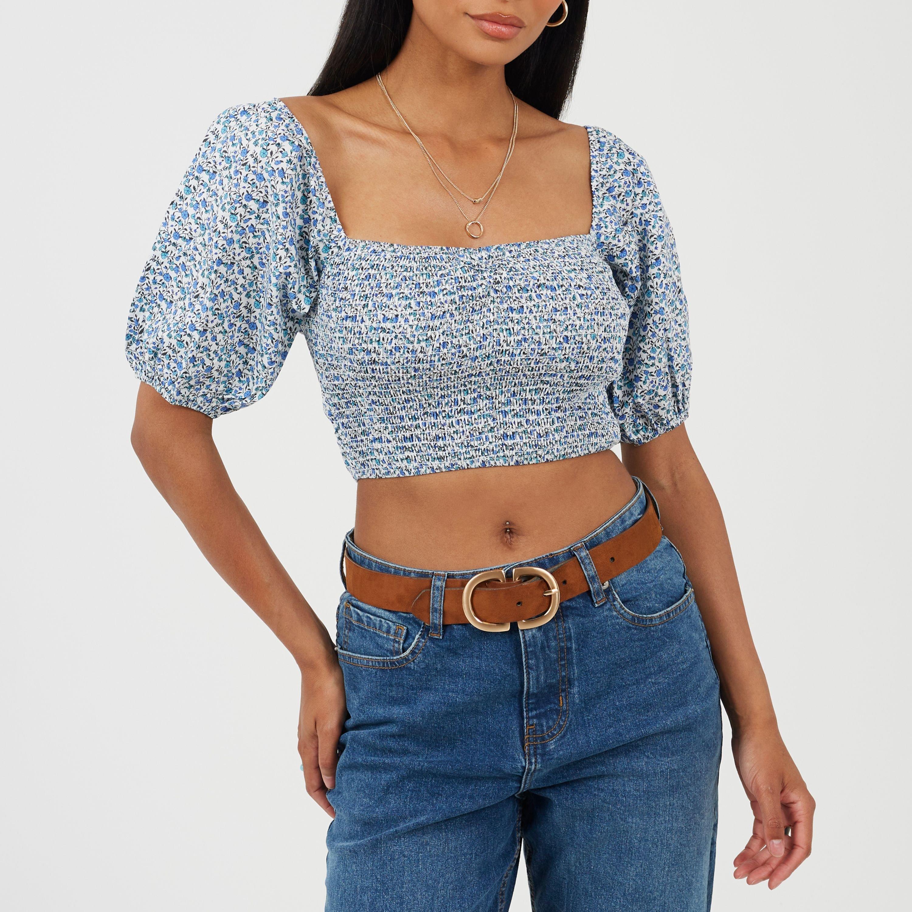 Womens Cropped Puff Sleeve Top with Shirred Body