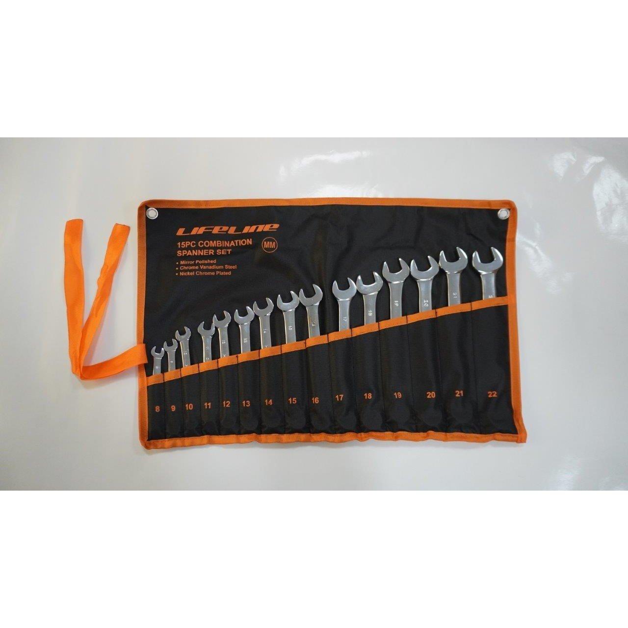 Set contains:15 pcs of Combination spanners, Full polished, Mirror finished Sizes: 8,9,10,11,12,13,14,15,16,17,18,19,20,21,22mm. Forged from the highest quality Chrome Vanadium steel Includes pouch with marked pockets for each spanner Open ends offset at a 15-degree angle for confined working areas 15-degree angle offset of box ends provides clearance over obstructions Corrosion-resistant Nickel chrome plated 25% More Torque than competitive spanners Equip yourself with these durable and versatile spanners for a seamless project experience.