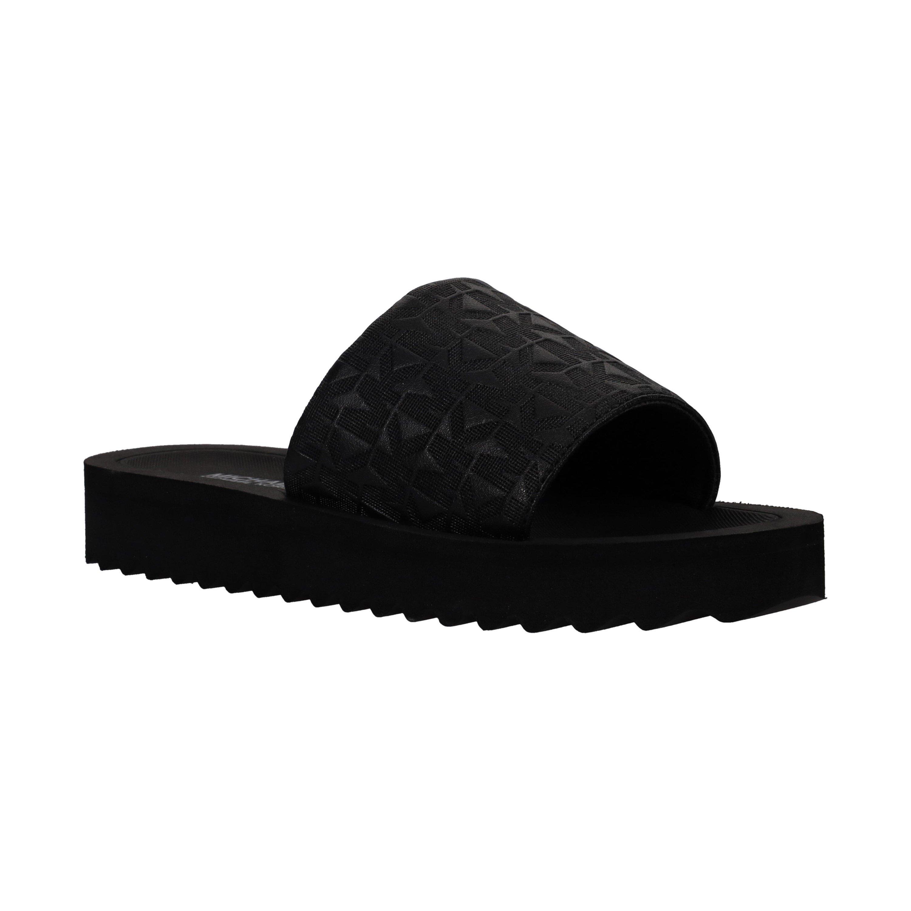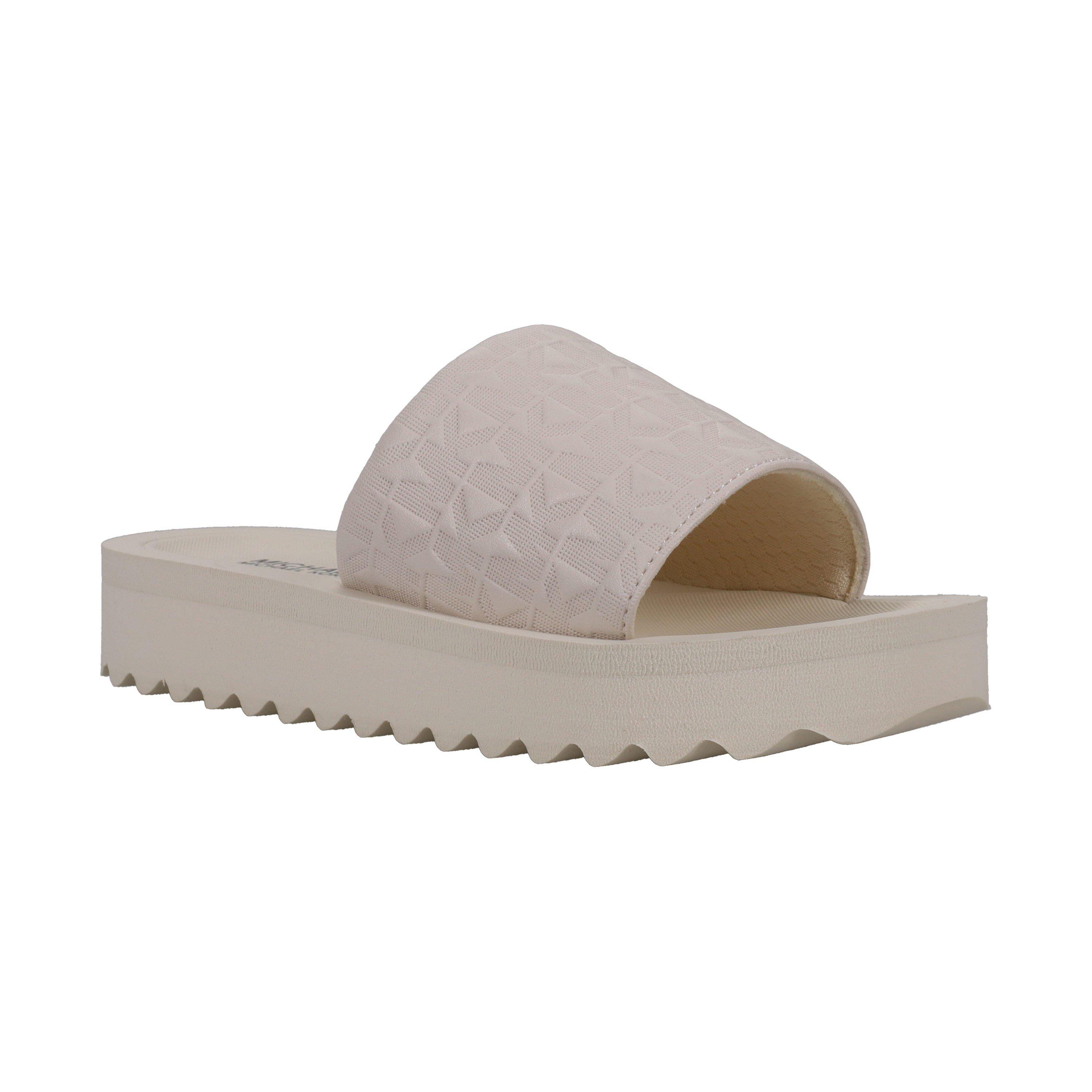 MICHAEL Michael Kors Kids' Mmk Teagan Merrick Pool Sliders offer style with practical design for the younger set. These poolside sandal essentials feature the well-known MK branding across a cushioned footbed, while the durable sole provides assured traction on wet surfaces. Designed with a contoured footbed that supports young feet during poolside activities and summer adventures.