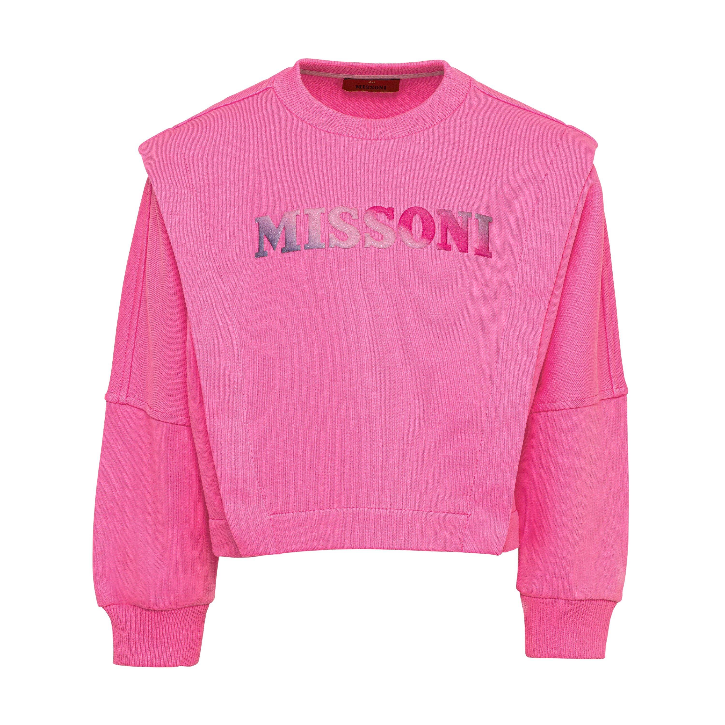 Complementing this ensemble are the jogging bottoms, adorned with an elasticated waist and cuffs for a secure and comfortable fit. Equipped with side pockets, your child can keep their essentials close to hand no matter where their adventures take them. Highlighting both pieces, the iconic Missoni logo is artfully constructed in glittery shades of purple and pink, a testament to the house's mastery of design. Whether your little one is playing with friends or heading on a family outing, the Cotton Logo Tracksuit is the perfect curated look for any occasion.