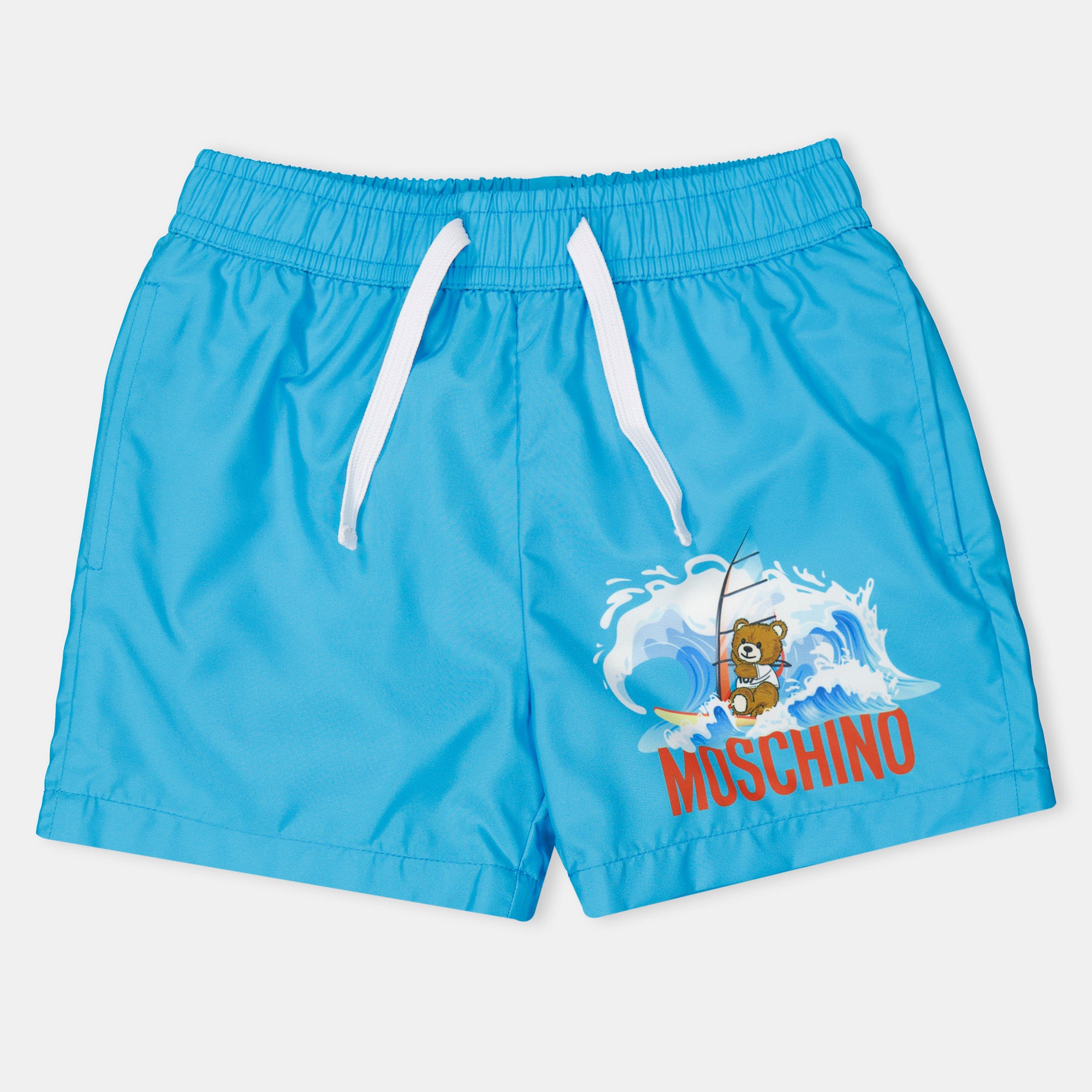 The Moschino Kids' Bear Logo Quick Dry Swim Shorts bring the brand's beloved teddy motif to poolside and beach wear, designed for active summer days by the water.