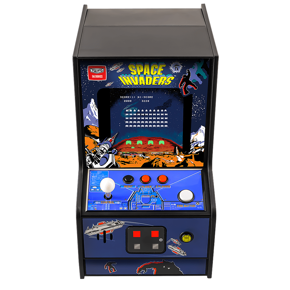 - Miniature playable replica of the original Space Invaders arcade cabinet.