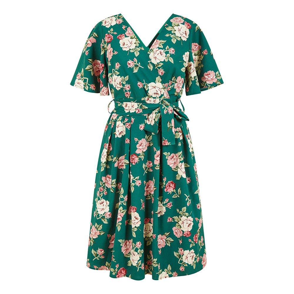 Women's Green Floral Wrap Skater Dress