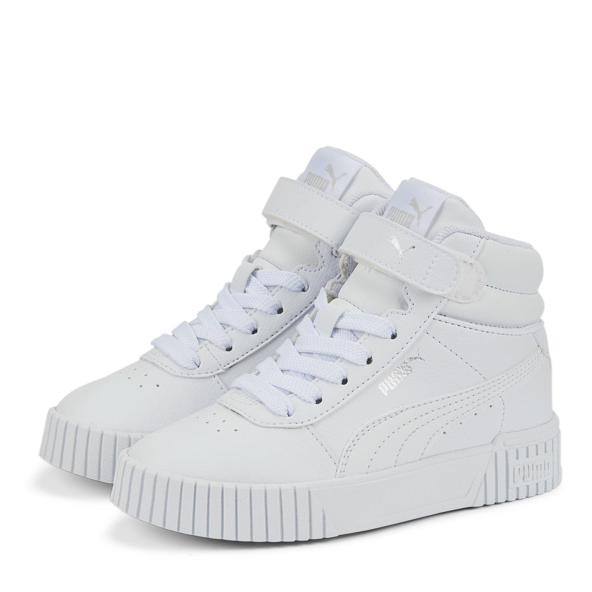 These Puma Carina Mid Trainers are a great addition to your child's collection, these stylish trainers are in a High-Top style with a round toe as well as a close fasten. The rubber sole has great traction, while the leather upper is hard wearing and durable. The look is finished with the brands signature Logo for brand recognition. Upper: Leather, Sole: Rubber.