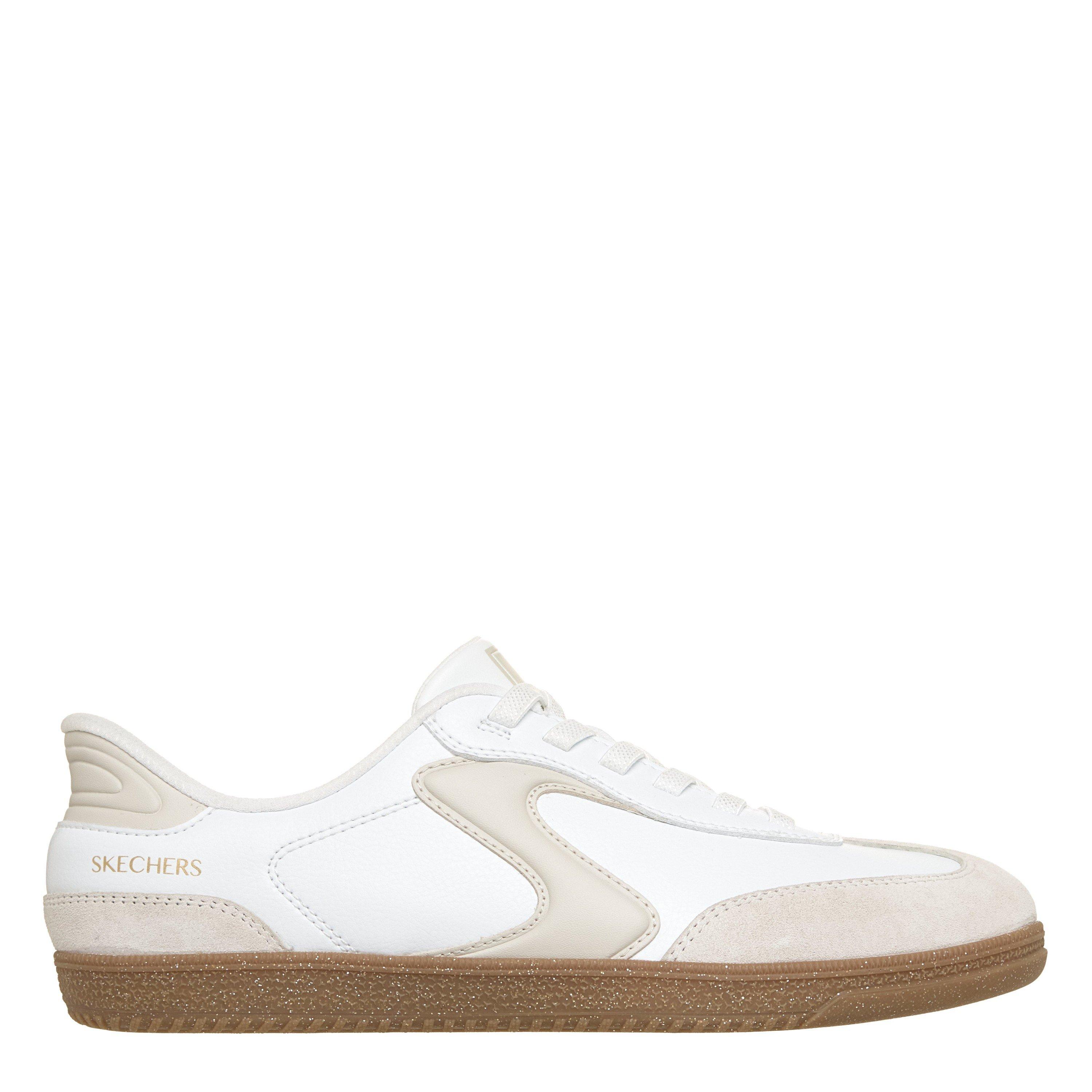 Design Details Duraleather and genuine suede overlay upper Court style slip-on with fixed stretch laces Contrast 'S' quarter logo detail Glittery gum midsole Flexible traction rubber outsole 3/4-inch heel height Skechers® logo detail
