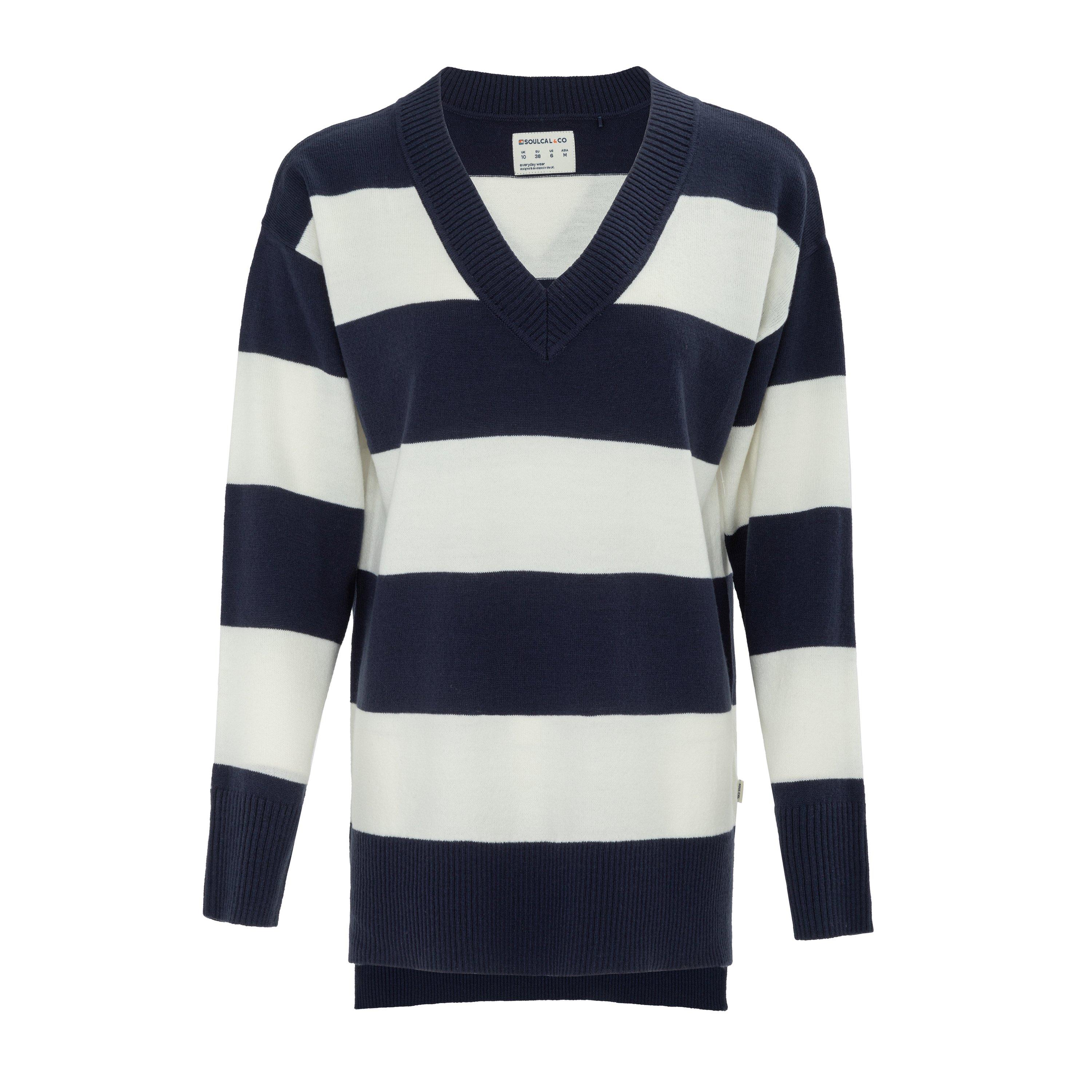 Details: Features a classic v-neck and long sleeves with rib detail at cuffs and hem, side slit asymmetrical hem.