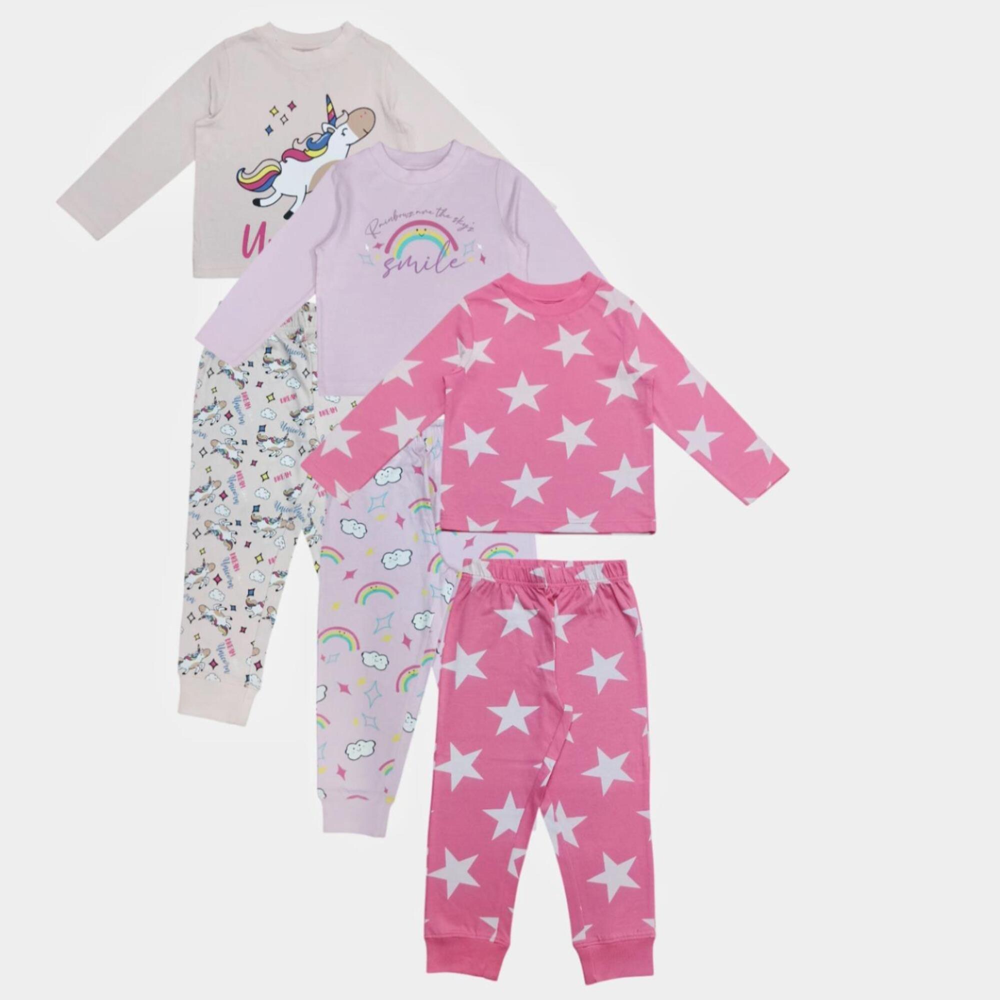 Star Kids' 3 Pack Long Sleeve Pyjama Set brings bedtime magic with fruit and unicorn prints. Made from soft, breathable fabric for cosy comfort, these mix-and-match sleepwear pieces feature crew-necks and long sleeves for warmth throughout the night.