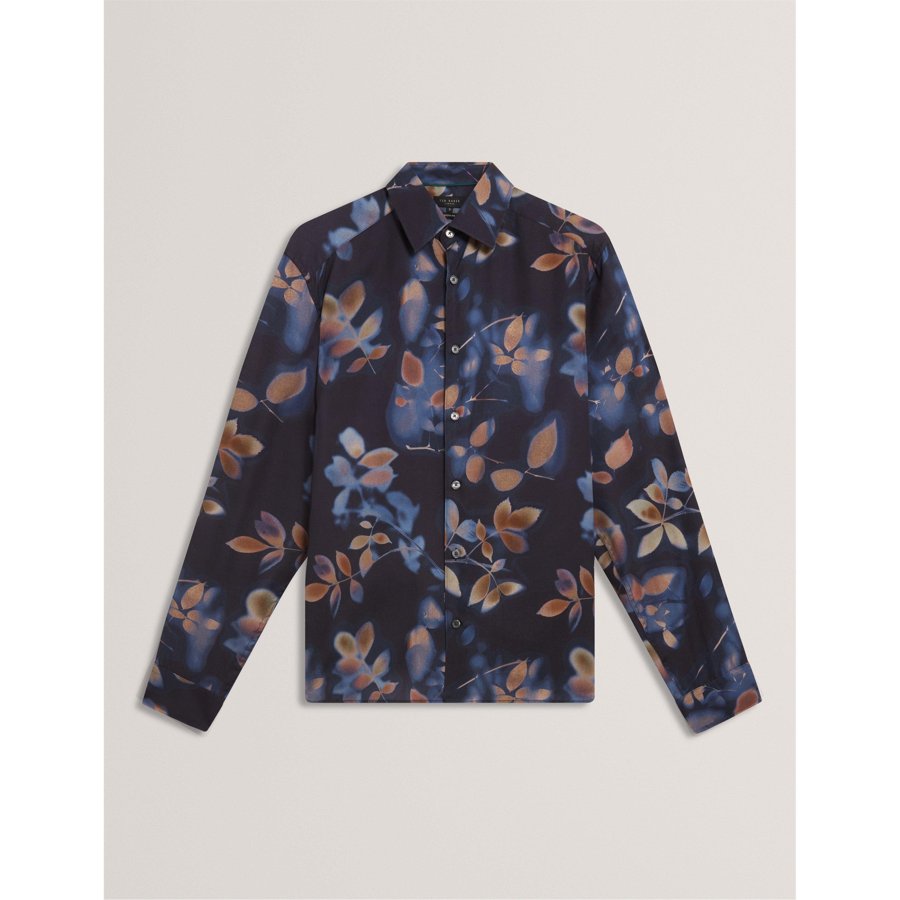 Ted Baker's Men's Leaf Print Long-Sleeve Patterned Shirt features a foliage design across a tailored shape. The pattern adds visual interest and is suitable for both casual and dressier styling.