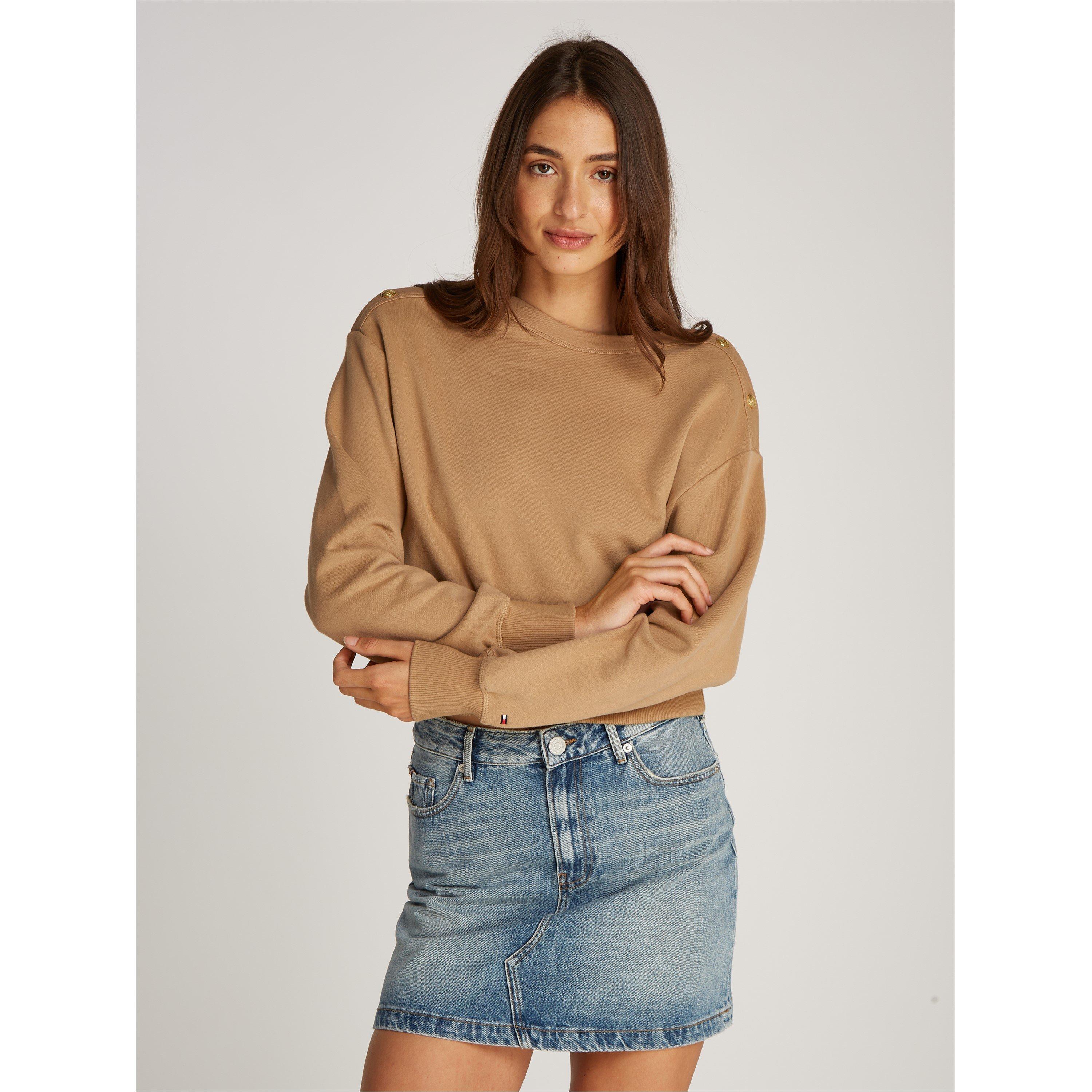 Tommy Hilfiger's Gold Button Boat Neck Sweatshirt balances everyday comfort with fine detailing. This pullover features a sculpted boat neckline with button elements, updating the classic sweatshirt style with contemporary fashion appeal.