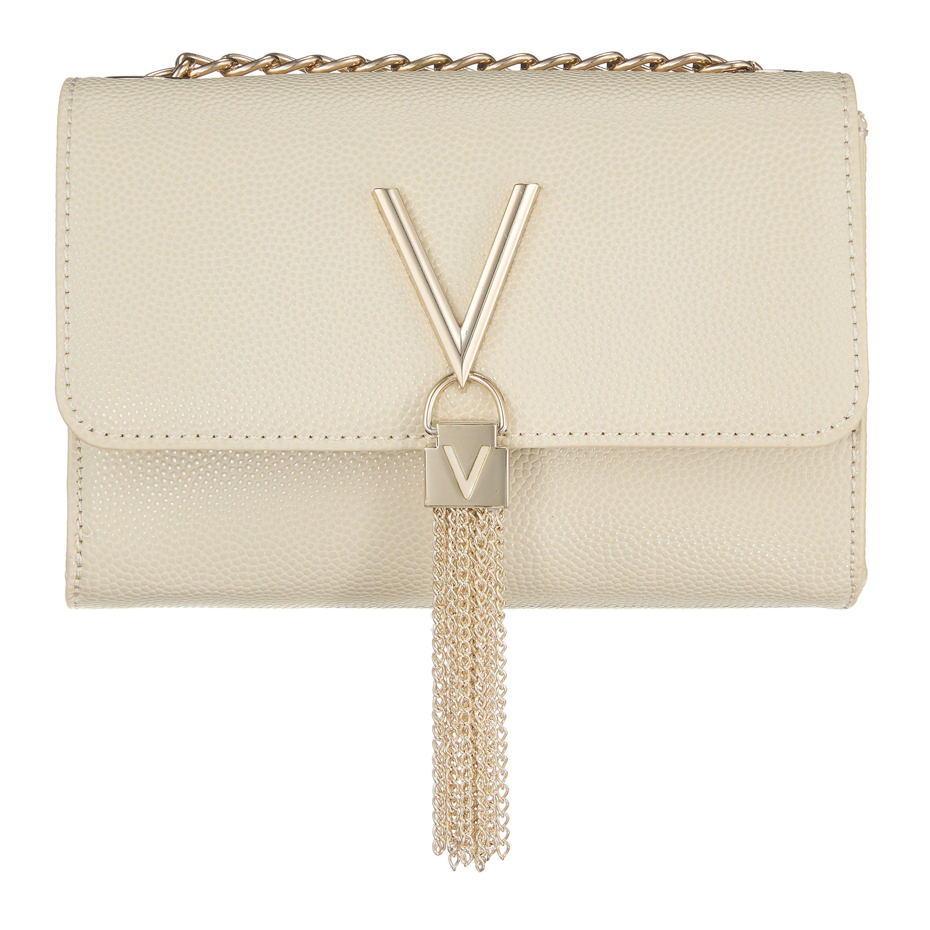 Enhance your collection with this Mario Valentino Fold Over Divina Bag. Constructed in a flap over style with a chain shoulder strap, it features button fastening an internal pocket for a classic look. This bag is designed with a metallic logo and is complete with Mario Valentino branding.