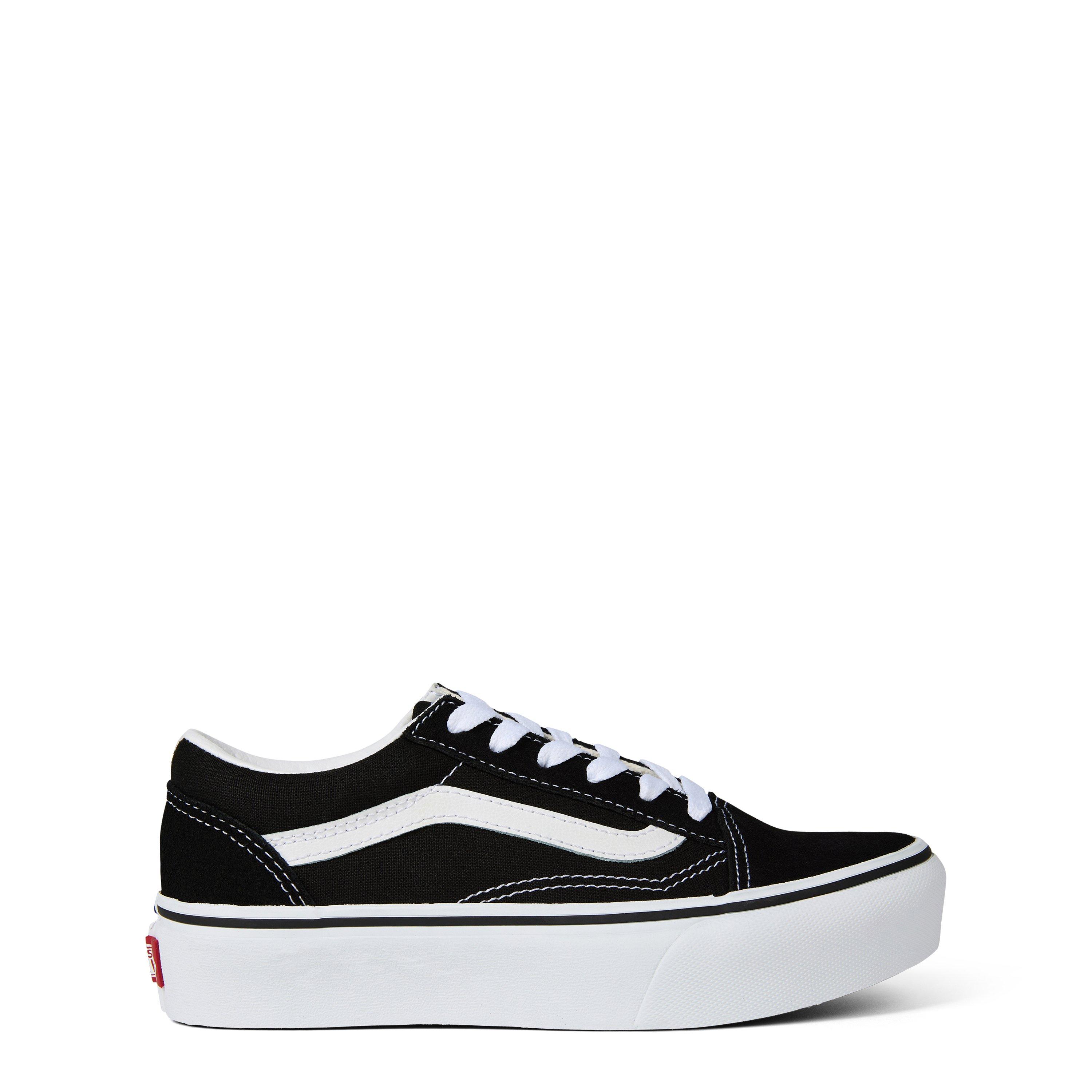 Vans Children's Old School Platform Trainers lift the famous skate style with added height, great for everyday playground-to-classroom wear. The classic sneaker shape features the familiar side stripe and waffle outsole, while the platform design delivers a modern fashion twist on the classic favourite that kids love.