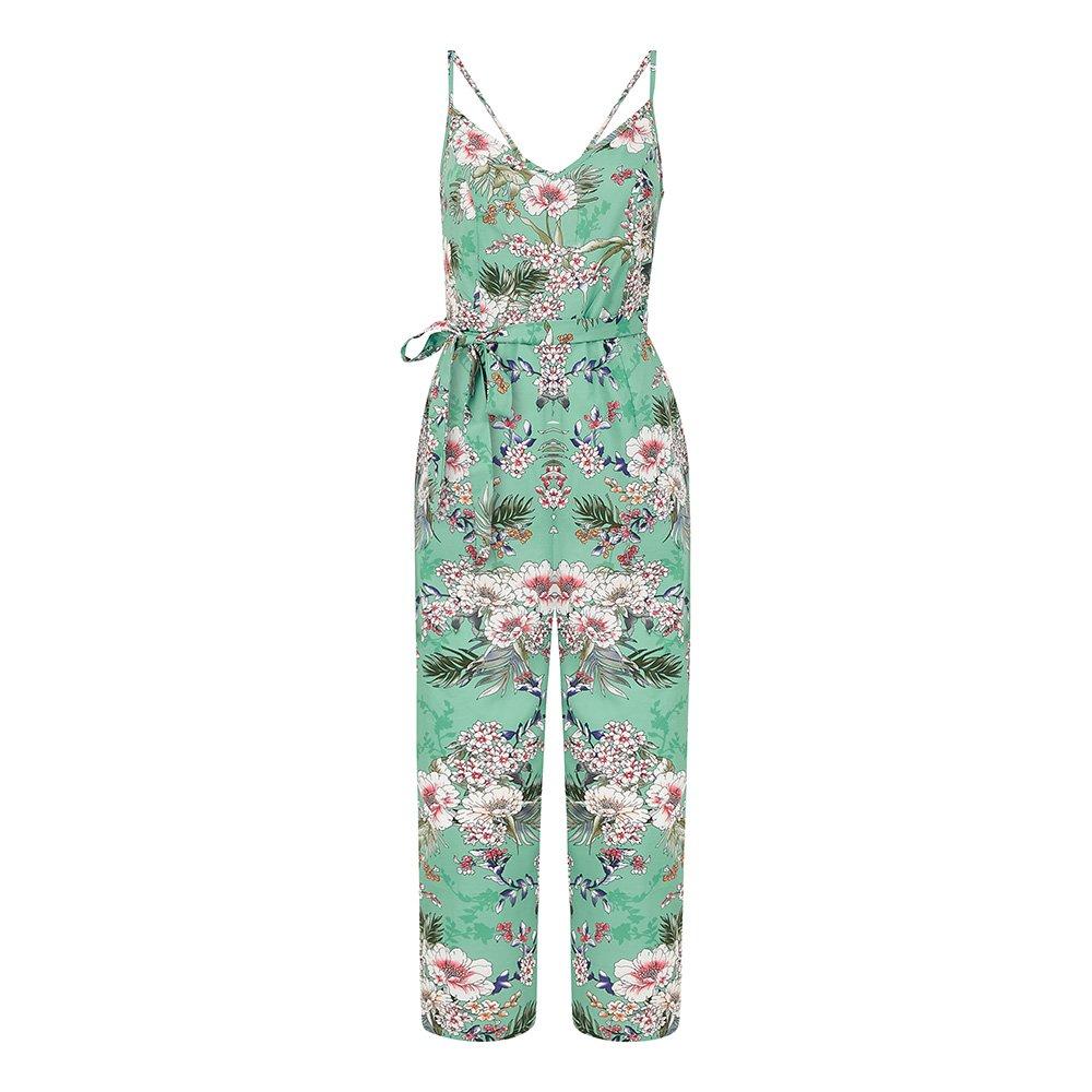Yumi's Tropical Palm Print Jumpsuit pairs tropical design with everyday wearability for easy style. The backdrop showcases contrasting palm pattern, while the all-in-one shape offers both style and practicality.